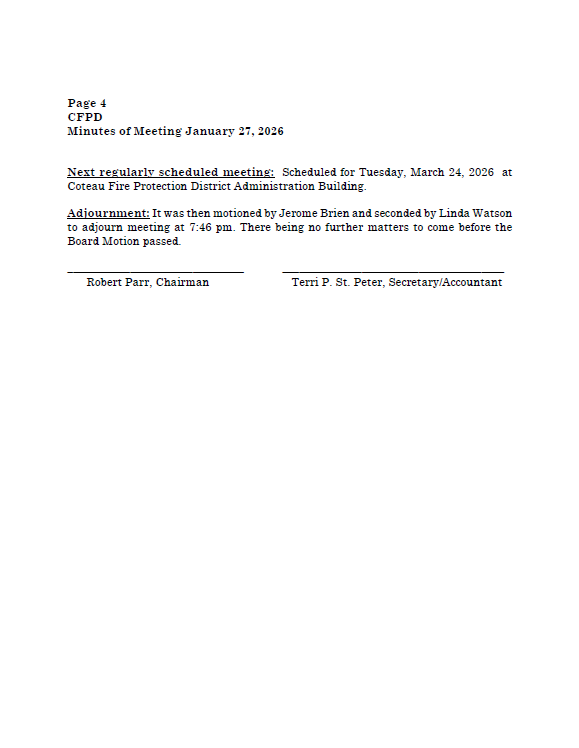 September 23, 2025 10058 The next meeting of the Coteau Fire Protection District is March 24, 2026 @ 7:00 pm. The agenda for the meeting will be available on Monday, March 23, 2026. If you wish to be sent a copy of the agenda, please send us an email with your request. Meeting AgendaMeeting Minutes